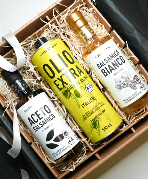 Mit diesem Geschenkpaket machen Sie Kennern der italienischen Küche eine große Freude. Der Aceto di Balsamico Bio ist ein absoluter Klassiker ebenso wie das Bio Olivenöl aus Kalabrien. Das optische, wie geschmackliche i-Tüpfelchen ist aber ganz sicher der goldene Balsamico Bianco. Er ist veredelt helle Dressings ganz sicher nicht nur wegen der Farbe.